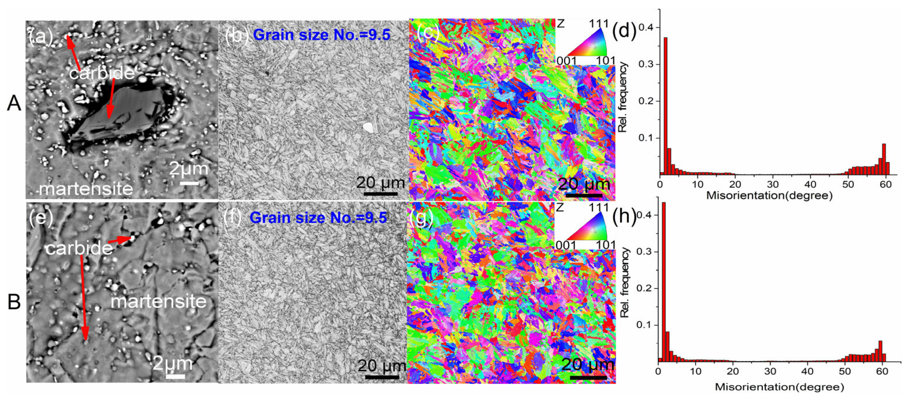 - H13 steels produced by electroslag remelting (ESR) and vacuum induction melting + vacuum arc remelting (VIM+VAR) exhibit similar grain size and microstructure. A comparison of the two samples reveals that they contain the same types of inclusions (composite inclusions of oxides and sulfides) and carbides (VC and M23C6). However, a significant disparity is observed in their distribution and size: ESR steel contains approximately four times more inclusions (>2 μm) and more than 20 times more carbides than VIM+VAR steel. The mean Feret diameter of inclusions/carbides was found to be approximately 4.5 μm in ESR steel and approximately 3 μm in VIM+VAR steel.