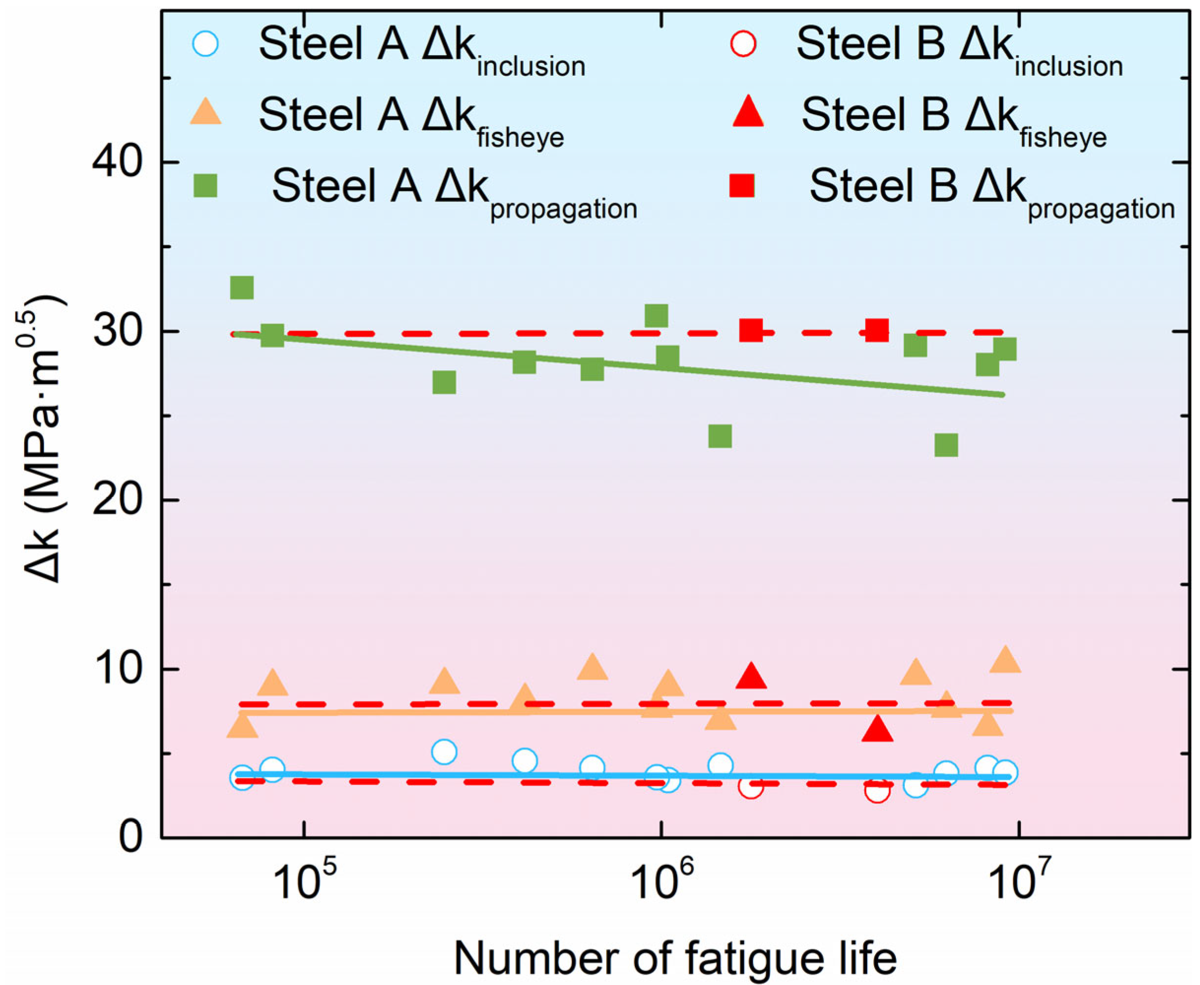 - Chapetti, M.D.; Tagawa, T.; Miyata, T. Ultra-long cycle fatigue of high strength carbon steels part II: Estimation of fatigue limit for failure from internal inclusions. Mater. Sci. Eng. A 2003, 356, 236–244. [Google Scholar] [CrossRef]