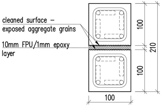 A case study considering a composite girder was conducted in order to assess how the mechanical properties of the flexible FPUs influence the mechanical behavior of composite structures. The composite girder comprised two reinforced concrete (RC) beams with a square cross-section measuring 100 mm × 100 mm, joined together with the use of either 10 mm thick FPU layer or an epoxy layer of thickness 1 mm (see: Figure 4). The span length of the symmetric, simply supported composite girder was . The concrete elements were reinforced with steel rebars, as presented in Figure 5 and Figure 6. The concrete cover was 10 mm thick, measured from the edge of the concrete to the outer edge of the stirrup. The main reinforcement consisted of four bars of diameter. The stirrups were two-legged with a diameter of .