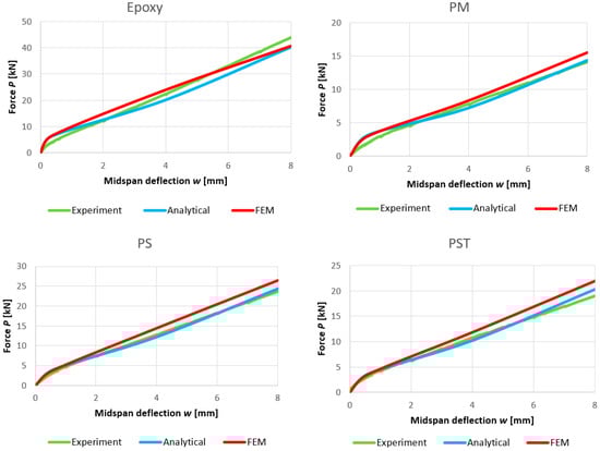 - Both analytical and numerical estimates are in good agreement with experimental records. Both these approaches seem to underestimate the deflection at Phase I. It may be stated that analytical model usually predicts higher load at first cracking, while numerical simulation provide lower loads compared to the experimental results. It is opposite in regard to the load corresponding with Phase II and Phase III, at least for most of analyzed cases. Relative error of these estimates is generally less than ca. 10% (Table 8). Exception should be made for the case of Phase I load estimation for highly deformable PM polyurethane. One should remember, however, that proposed method of experimental estimation of the Phase I load and deflection is based not on direct crack observation but rather on recorded changes in instantaneous flexural stiffness—this may be partially the source of the observed discrepancies.