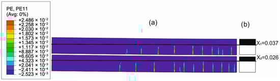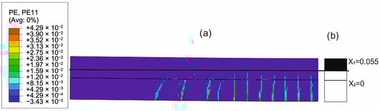 To evaluate the ability of the analytical model to approximate the concrete cracking process through the determined constant effective height of the working concrete zone, the distributions of cracks in concrete obtained from the FEM solutions were compared with the uncracked heights of both beams obtained with the analytical solutions. Figure 20, Figure 21, Figure 22 and Figure 23 present such comparisons for all analyzed cases in Phase III.