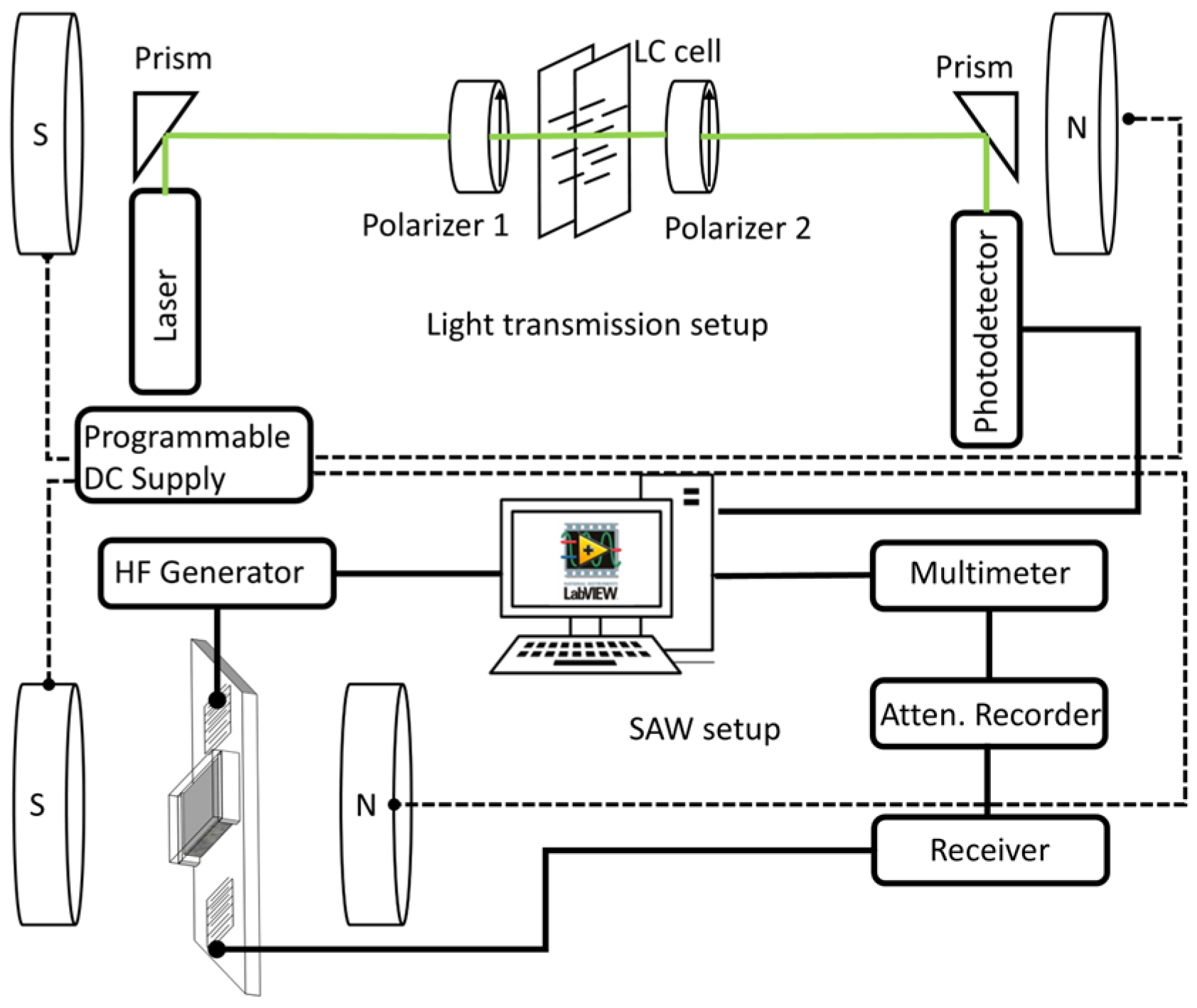 Figure 2—lower part). The substrate holder was part of the thermostatic measuring chamber. SAW pulses (~1 µs) at a frequency of 10 MHz were generated by the first interdigital transducer and, after passing the NLC cell, were registered by the second transducer. The received signal was detected using the attenuation recorder, and similarly, the LT intensity was monitored as a function of the magnetic field or time. The initial intrinsic arrangement of NLC molecules in the measuring SAW cell is supposed to have a predominant alignment in the plane of the NLC cell. The reason is that we used an optically polished LiNbO