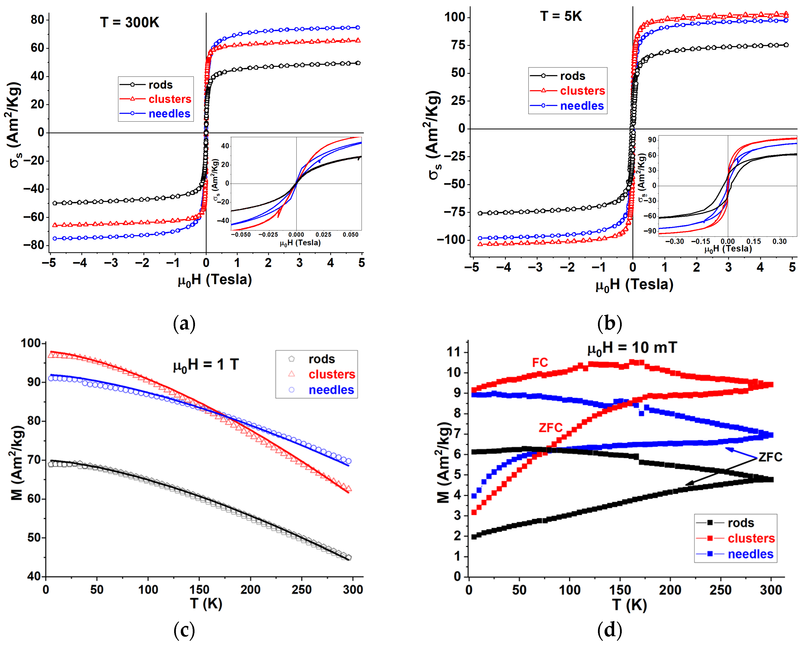 Figure 3b displays the low-field magnetic response, showing the coercivity and remanence present at low temperature, and reveals a ferrimagnetic nature of all the samples. The revealed coercivity is 0.0054, 0.0015, and 0.0227 T for needles, clusters, and rods, respectively. The rods exhibit the greatest remanence, 21.1 Am
