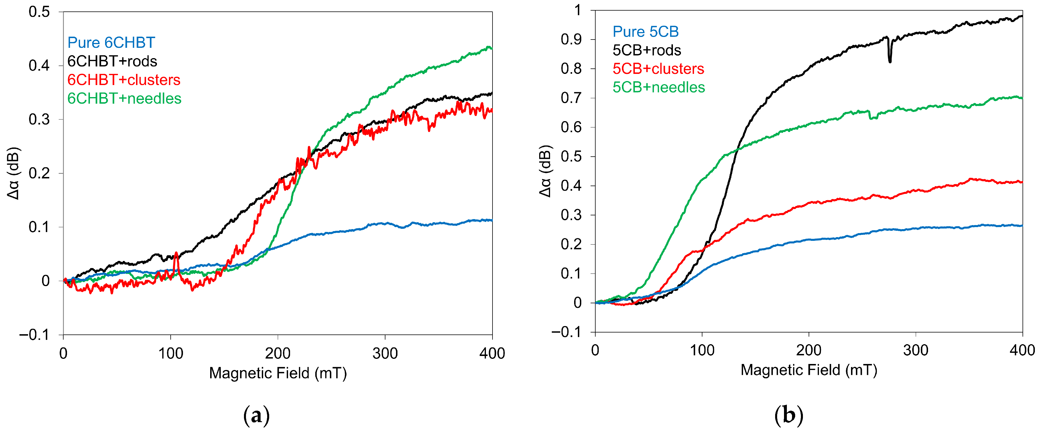 −4 was chosen as an adequate concentration for the comparison of the role of different nanoparticle shapes. The magnitude of the magnetic field effect depends on both the shape of the magnetic particles and the type of NLC. In nearly all investigated composites, the attenuation changes (Δ