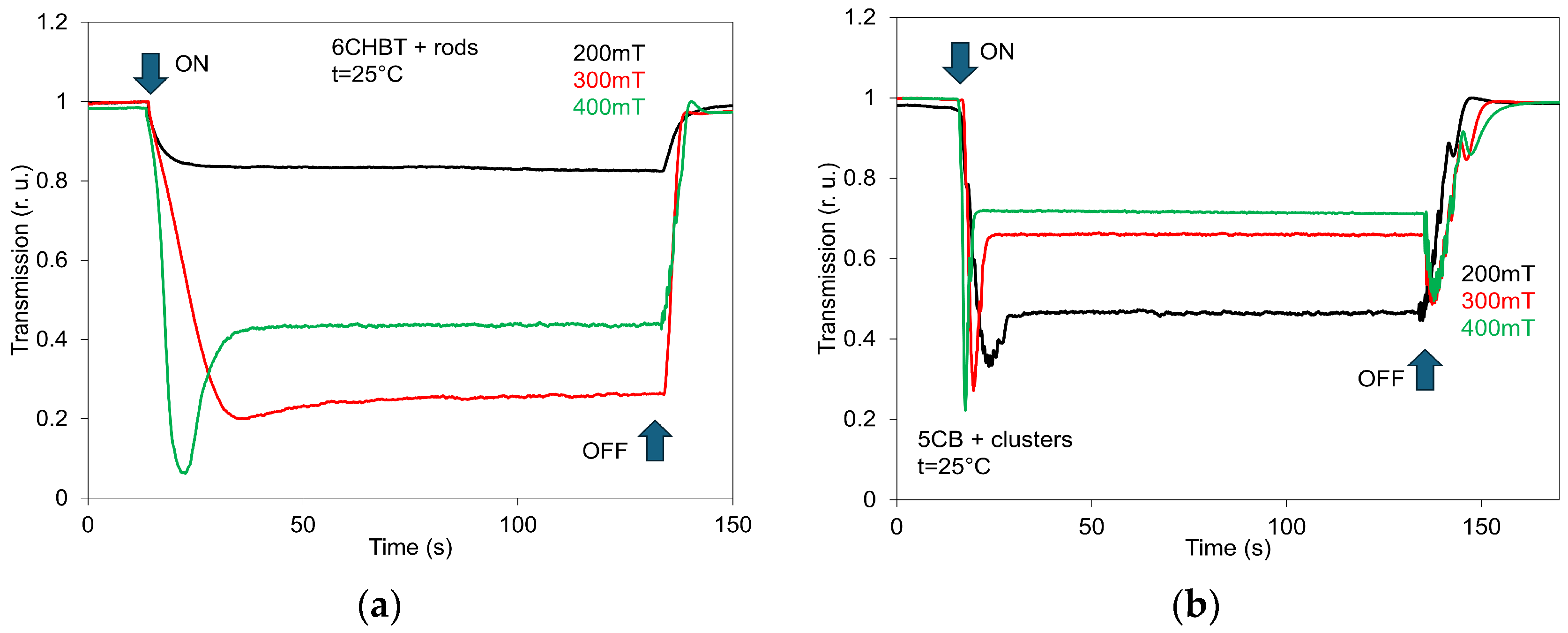 4 nanoparticles in rod form (a) and for 5CB doped with cluster-shaped nanoparticles (b), recorded at different magnetic field strengths (200, 300, and 400 mT) as representative examples. The LT time responses, similar to those obtained for the other composites, are fully consistent with the corresponding LT characteristics shown in