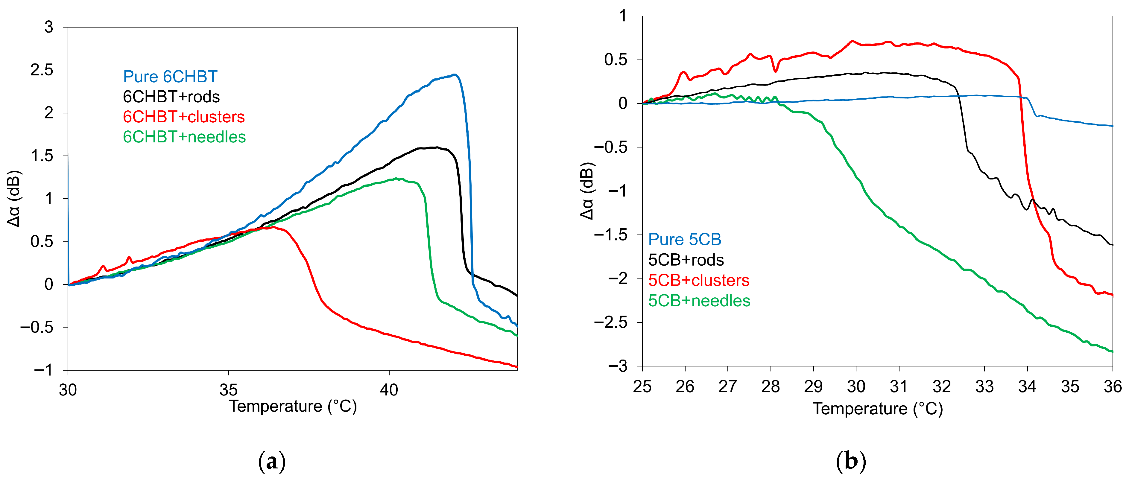 Figure 11b), it is needles, rods, and clusters, with a particularly pronounced shift for composites containing cluster nanoparticles. The shift in phase transition towards lower temperatures for NLC composites can be attributed to the anchoring interactions between NLC molecules and nanoparticle surfaces, which disrupt the orientational order of the NLC [