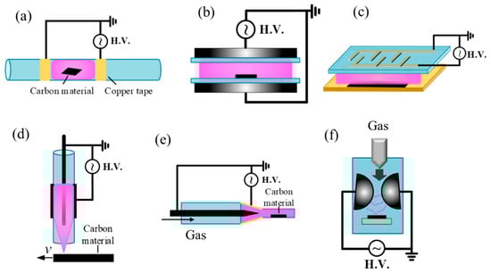 Schematic of several types of gas-phase plasma setups for material science; (a) coaxial type DBD reactor; (b) plate-to-plate DBD reactor; (c) surface–DBD systems; (d,e) APPJ; (f) gliding arc reactors.
