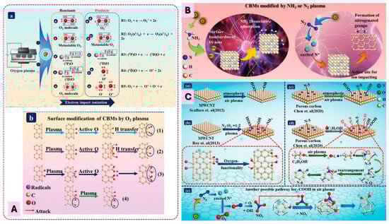 Plasma modification has become a powerful tool for controlling the surfaces of CMs. Active species generated in discharges at gas phase or liquid surface, such as electrons, ions, radicals, and metastable, and these active species interact with material surfaces to induce both physical and chemical changes [35]. These processes enable the incorporation of polar oxygen-containing functional groups (OFG), introduce nanoscale roughness, and expose more active sites without altering bulk properties [12,36]. As a result, plasma treatment can optimize electronic structures and impart new functionalities, thereby enhancing catalytic activity, luminescence, adsorption, and other material properties [26,37].