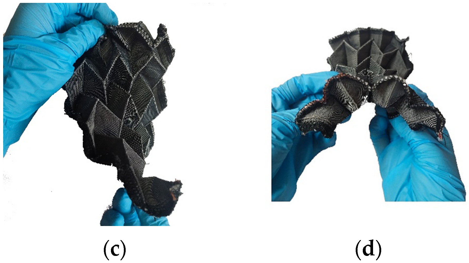 - Luan, K.; West, A.; DenHartog, E.; McCord, M. Auxetic deformation of the weft-knitted Miura-ori fold. Text. Res. J. 2020, 90, 617–630. [Google Scholar] [CrossRef]