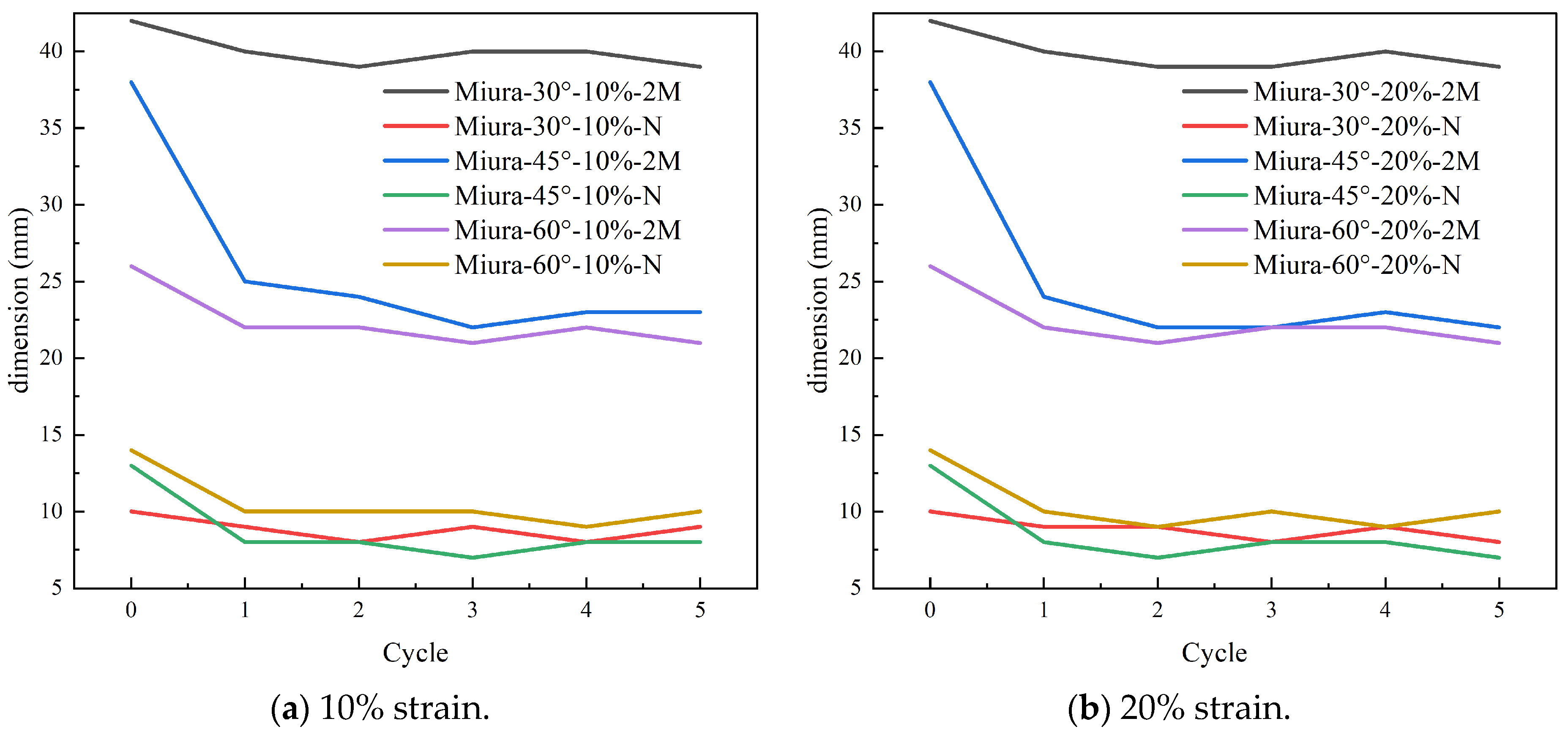 - The initial cycle induced considerable deformation in the Miura-ori auxetic woven fabric, with subsequent cycles exhibiting stabilized behavior, confirming its structural stability under tensile loading: when the Miura-ori structure angle was 30°, the elastic recovery was better.