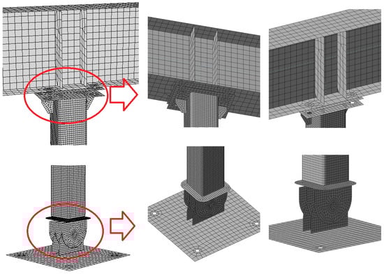 The meshing employed in numerical analyses is illustrated in Figure 3. The maximum size of the element in the mesh created was 50 mm, with the number of elements on the SHS wall set at 16, and 12 for the webs and flanges of the other elements.