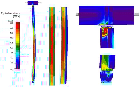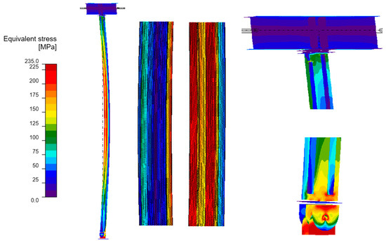 Maps of equivalent stresses obtained using GMNIA analysis for models A–D are presented in Figure 6, Figure 7, Figure 8 and Figure 9. Each figure is composed of two images: a general view of the column, and close-up views of the central part and the connections. As demonstrated in the close-up images of models A and D, mesh refinement around the centre of the column facilitates the distinction between the SHS120×120×5 core and the welded elements. A significant disproportion of the stress values calculated in the original element (SHS) and in the reinforcing elements is evident in all the models. The phenomenon under discussion is the result of the preload, which is applied to the column prior to the implementation of reinforcement. A further factor that contributes to the stress disproportion is the absence of technical capability to connect the stiffening elements directly to the connection plates. These aspects have been shown to have a significant impact on the effectiveness of the reinforcement.
