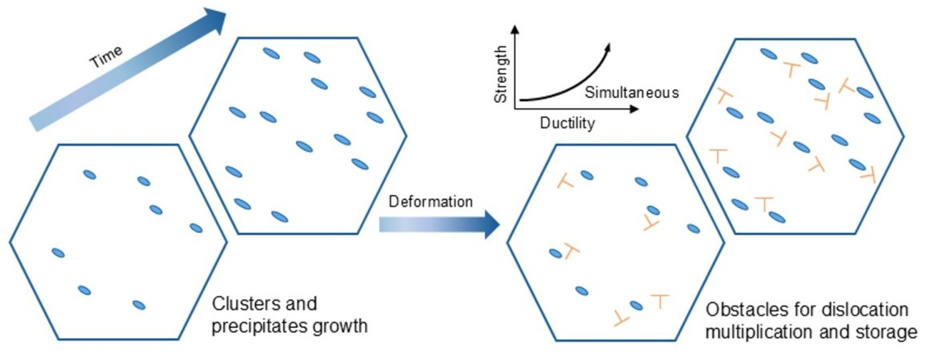 - Huang, Y.; Xu, S.; Li, X.; Gao, J.; Zhao, H.; Wang, S.; Yang, T.; Liu, S.; Han, X.; Mao, X. Cluster mediated high strength and large ductility in a strip casting micro-alloyed steel. Acta. Mater. 2024, 276, 120102. [Google Scholar] [CrossRef]