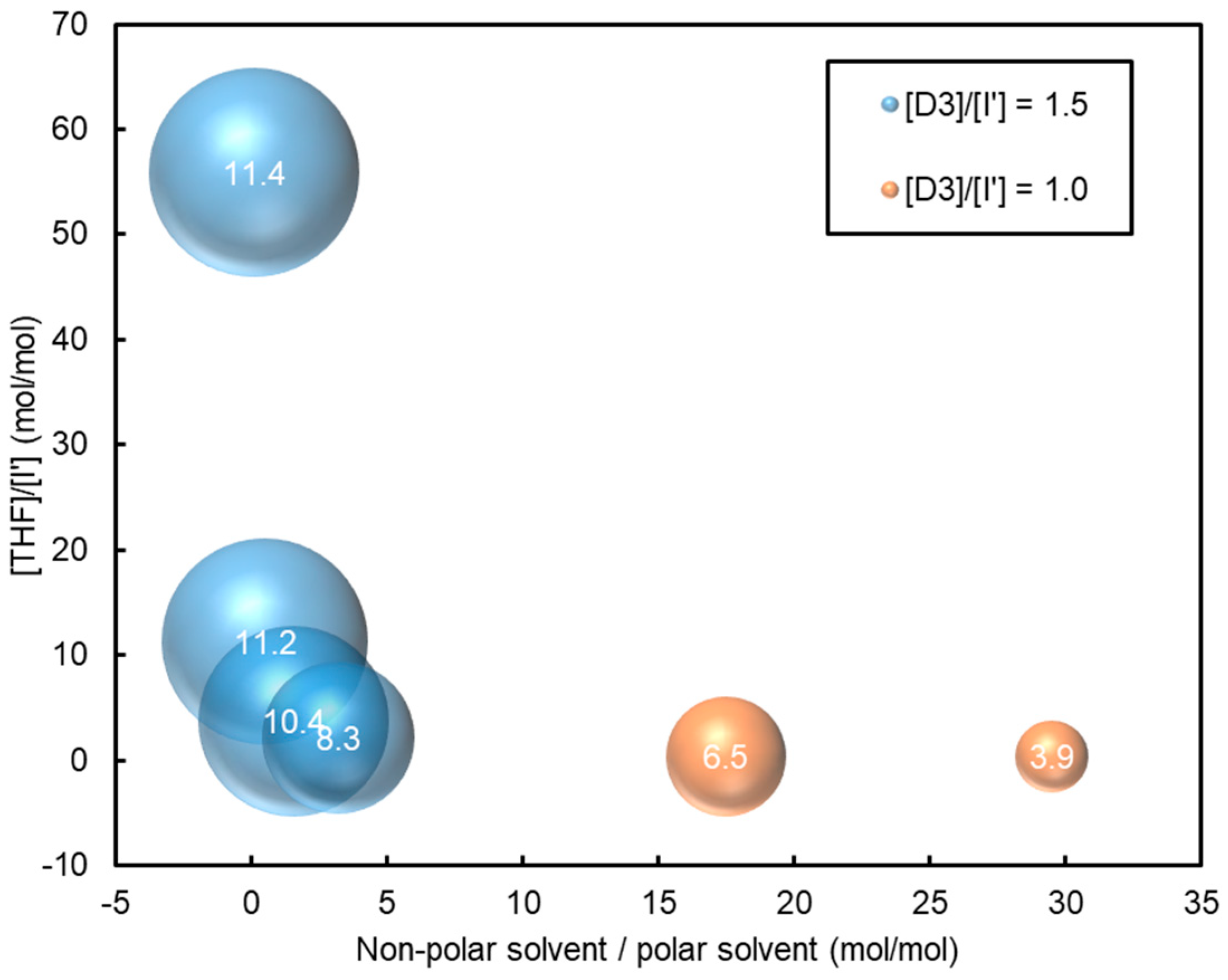 | Entry | Initiator (I′) [mmol] | D3 [mmol] | Hexane [mmol] | Toluene [mmol] | THF [mmol] | [THF]/[I′] | [D3]/[I′] | Np/P [a] | Si [b] | Si * [c] |