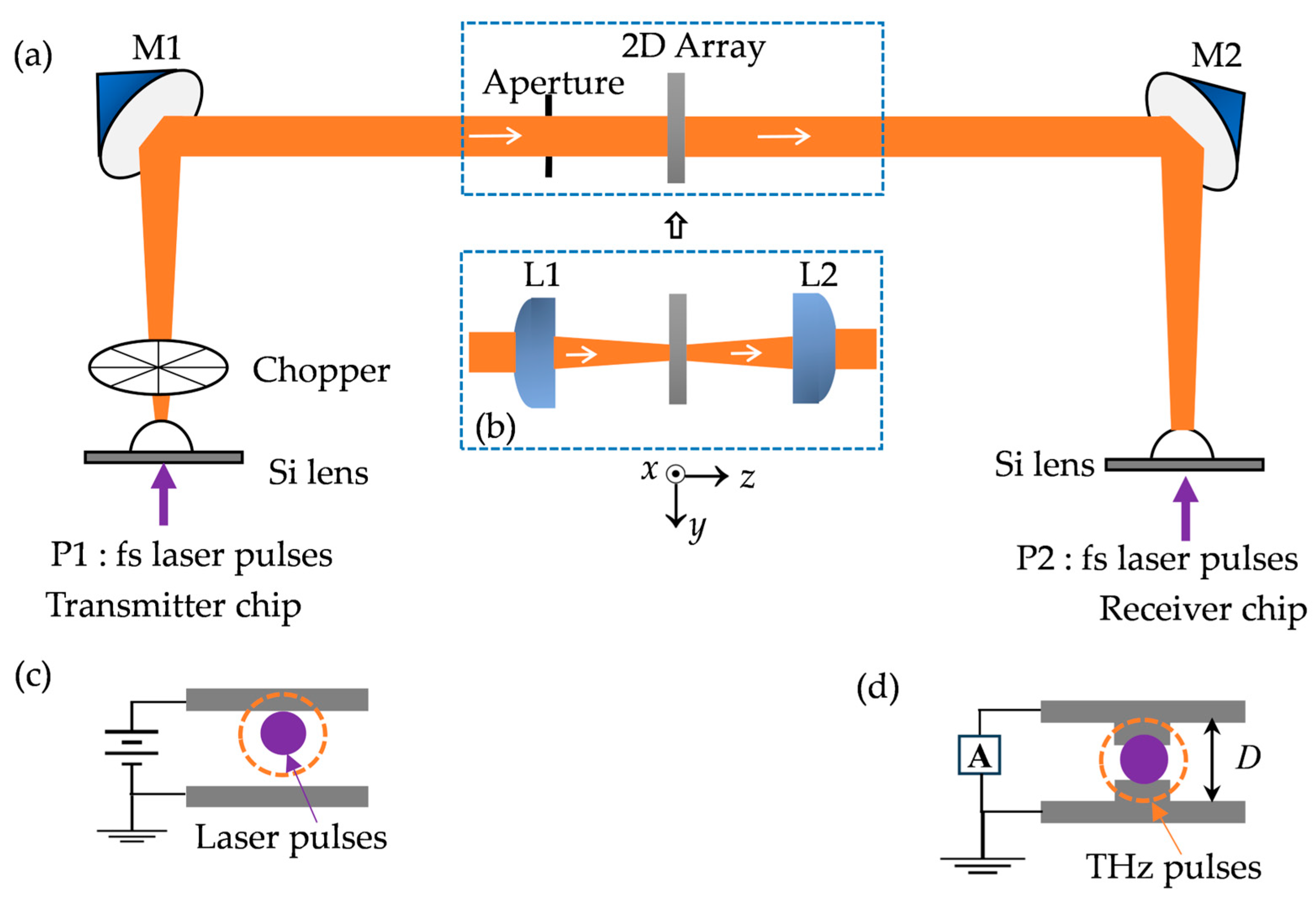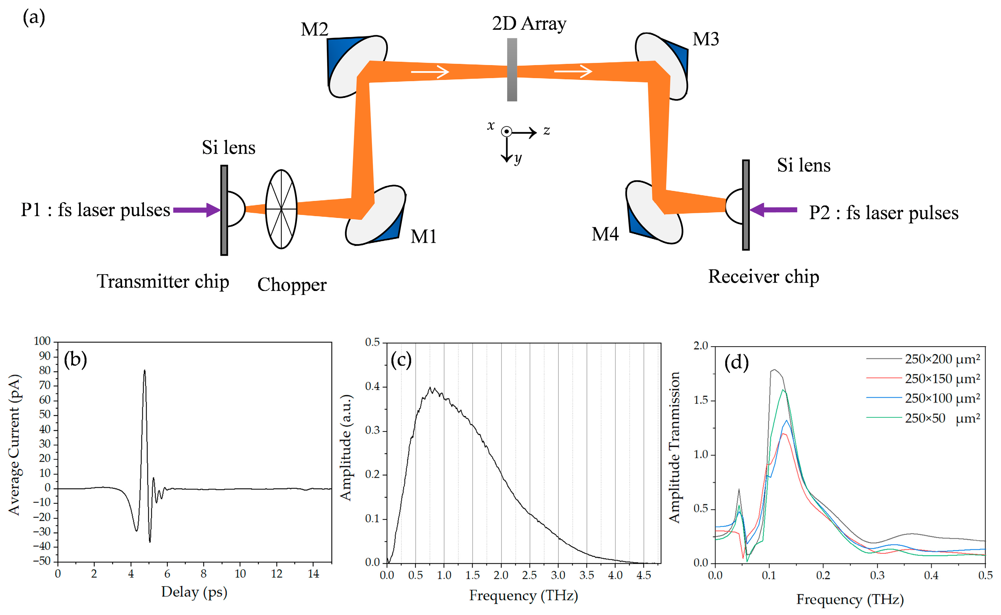 Figure 2a, we utilized a four-focal-length (4-F) THz-TDS system with a parallel terahertz beam between the paraboloidal mirrors M1 and M2. The array sample was fixed to a thin copper plate, centered over a 15 mm diameter aperture in the plate that defined the optical aperture. The system is aligned into a 4F confocal geometry that enables excellent beam coupling between the terahertz transmitter and receiver. At first, the receiver’s photoconductive antenna had a total dipole length of