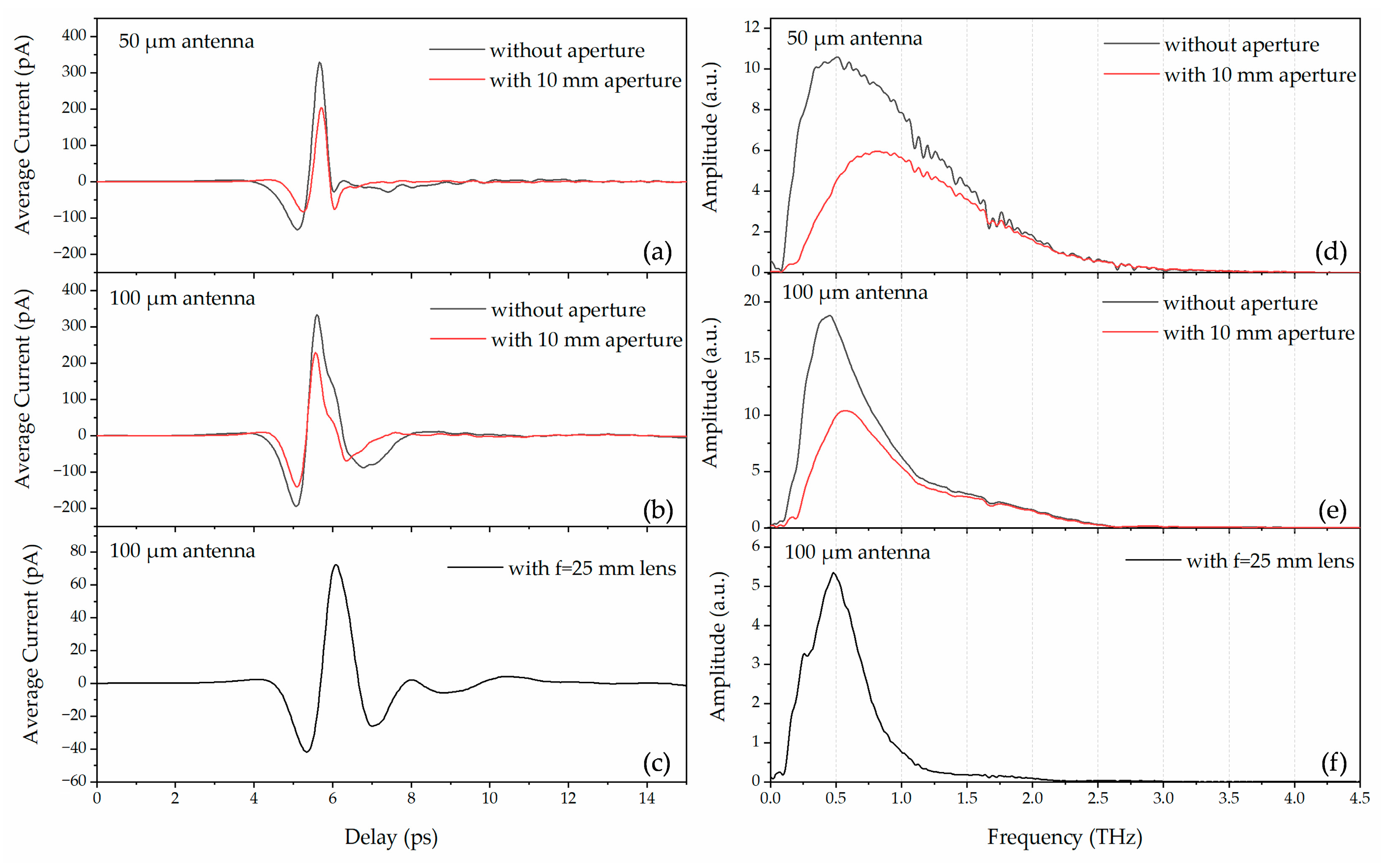 Figure 3b,e, we noticed that with aperture (red curves), the central frequency is blue-shifted to 0.6 THz while the aperture of the low-frequency component is greatly reduced, thus leading to an extremely low signal-to-noise ratio that is not able to support accurate measurements of plasmonic transmission properties of the array resonating at D-band frequencies.
