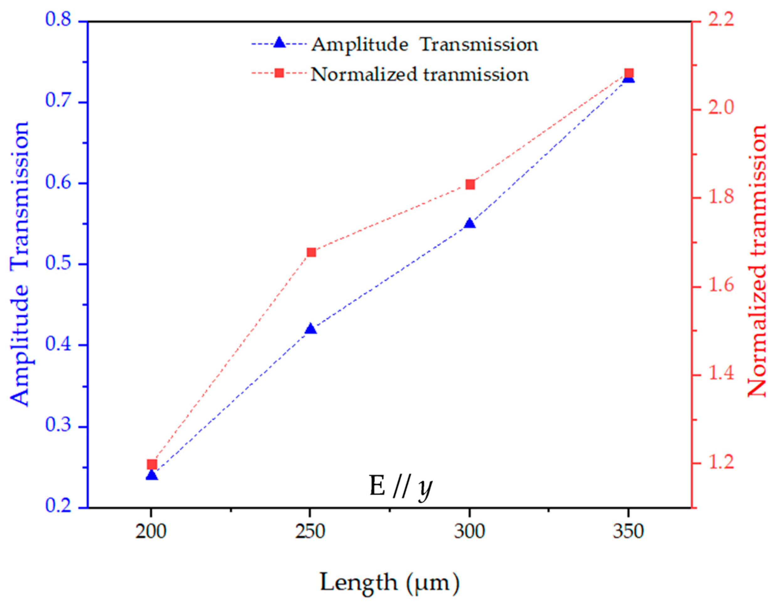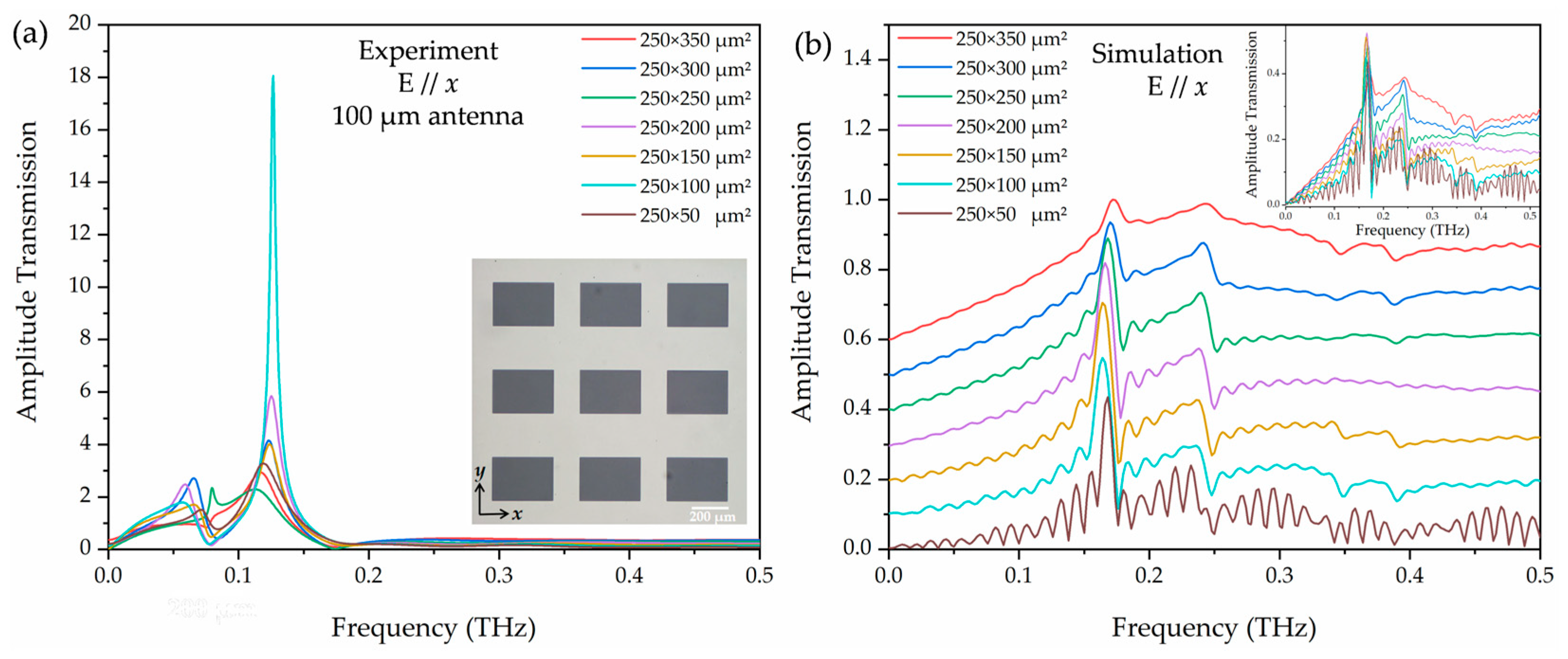 Figure 5c shows the absolute and normalized peak transmission amplitude as a function of the aperture width acquired from the measurements. When the array length is fixed at 250 μm, the array width has a broad effect on the field enhancement. Several well-defined resonant features were observed and essentially attributed to the resonant excitation of SPs at terahertz frequencies. The absolute (blue scatters) and normalized (red scatters) amplitude transmission approach the maximum at 250 × 350 μm