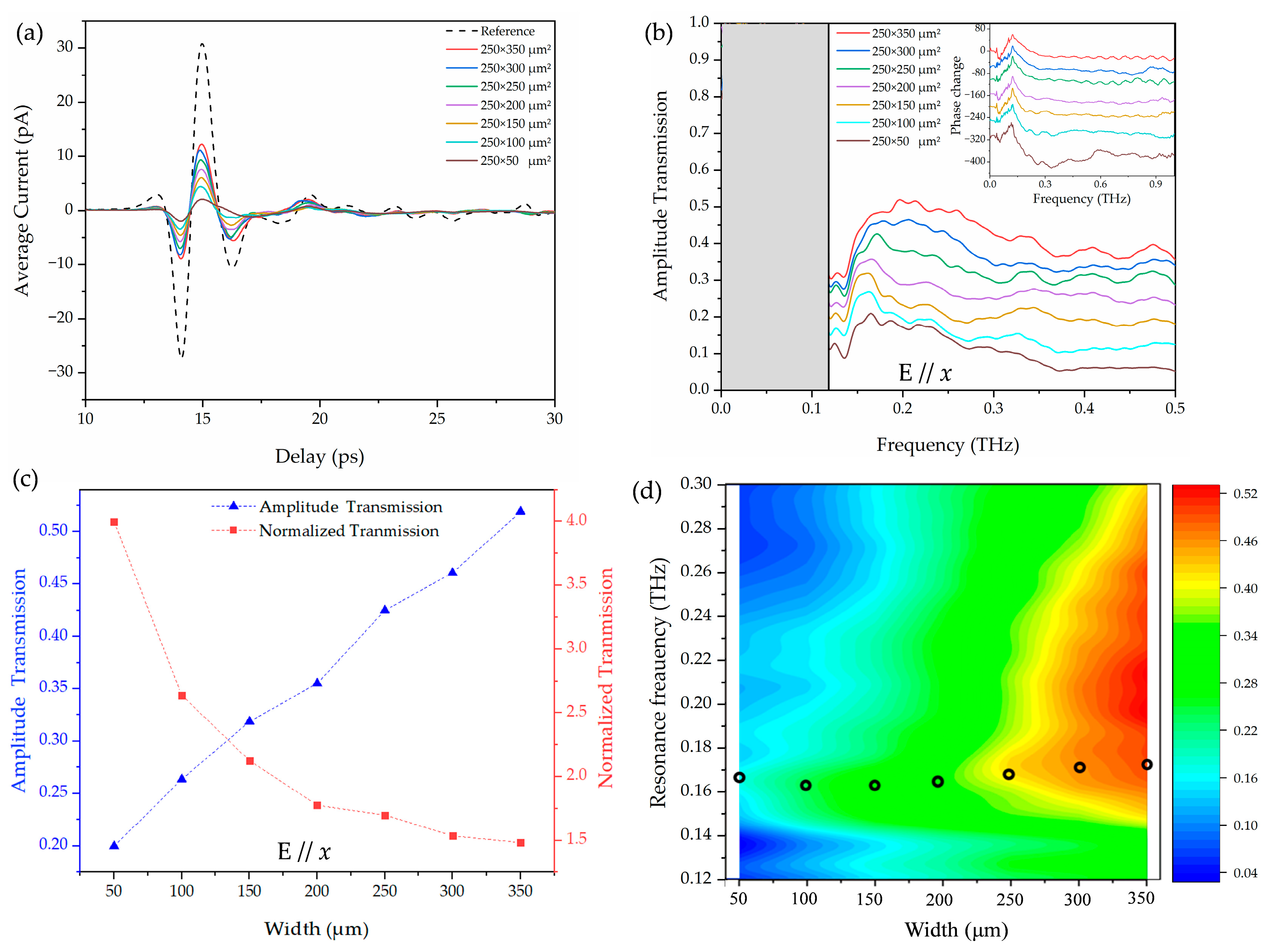 Figure 5a illustrates the measured transmitted terahertz pulses through the reference and the D-band plasmonic arrays with various aperture widths ranging from 50 to 350 μm using the THz-TDS system illustrated in
