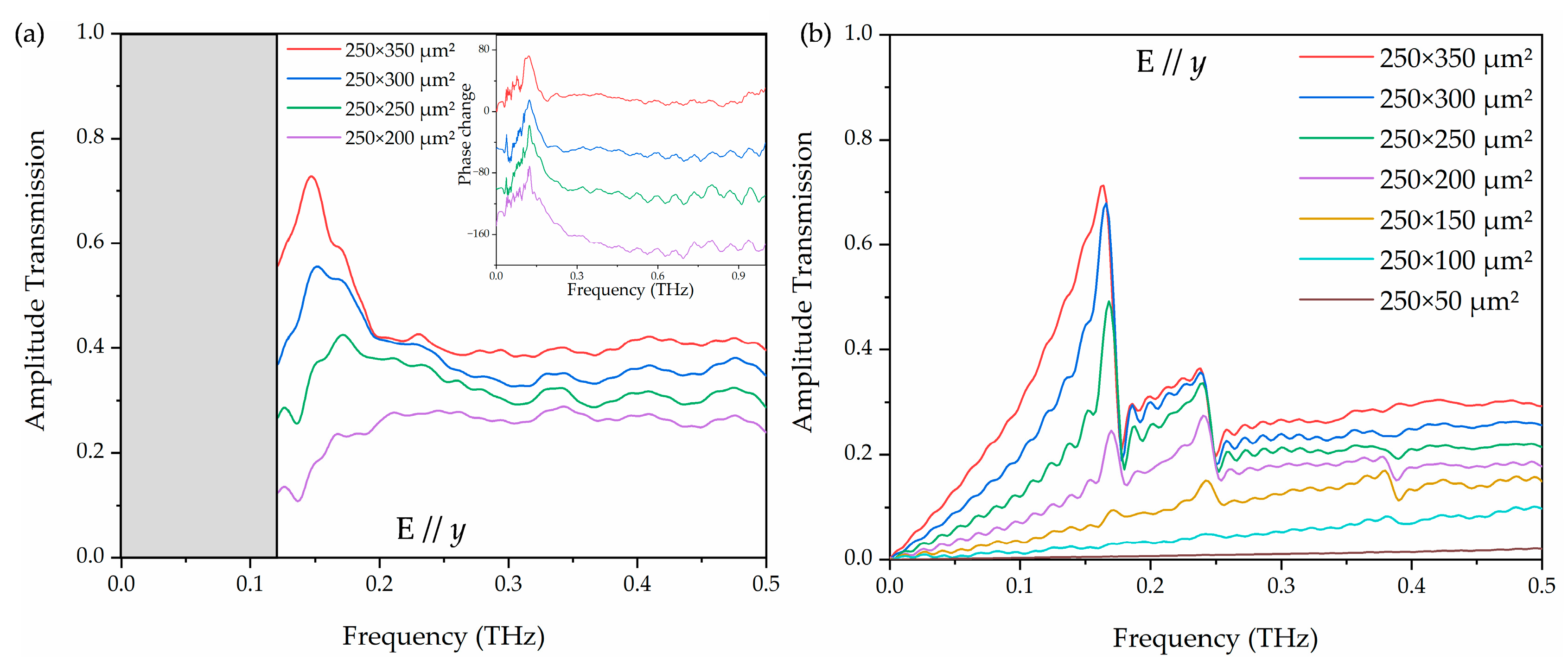 Figure 5b shows the frequency-dependent amplitude transmissions of the Fourier-transformed terahertz pulses and phase change (inset). It is interesting to note that the measured absolute amplitude peak transmission exhibits a significant increase as the aperture size increases.