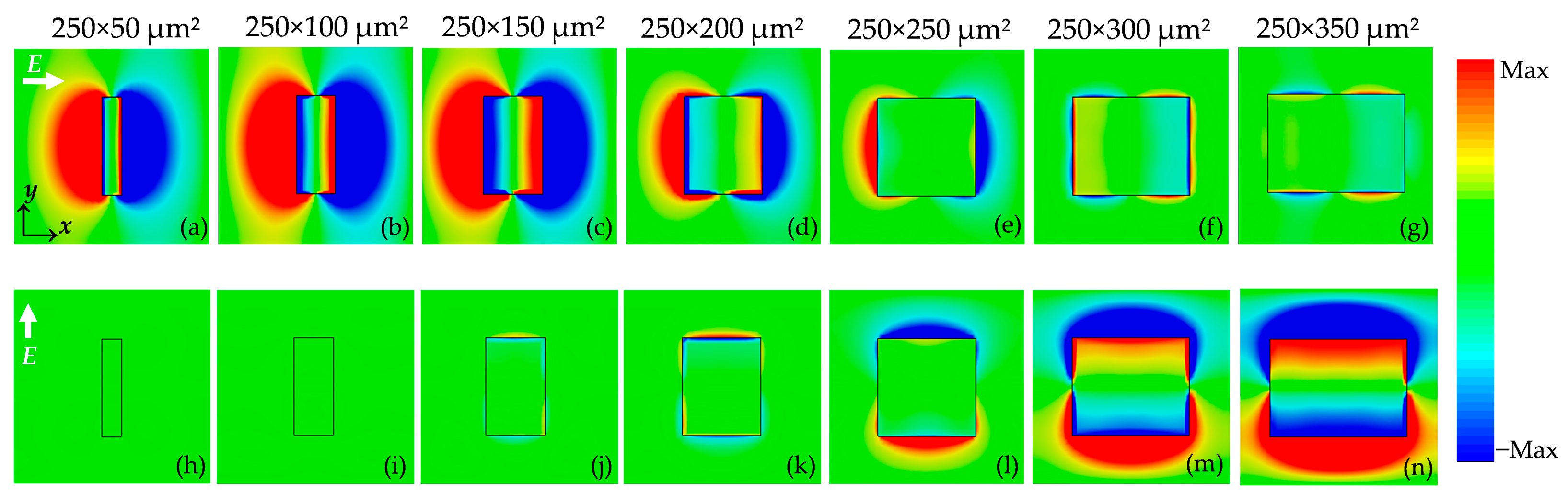 Figure 8h–n, the apertures do not support a pronounced dipolar pattern along the short side, and only weak edge-localized fields are observed for widths below 200 µm. The widest apertures (300–350 µm) indicate that a strongly propagating DLSP mode is formed. This polarization-selective DLSP mode directly explains why the E//