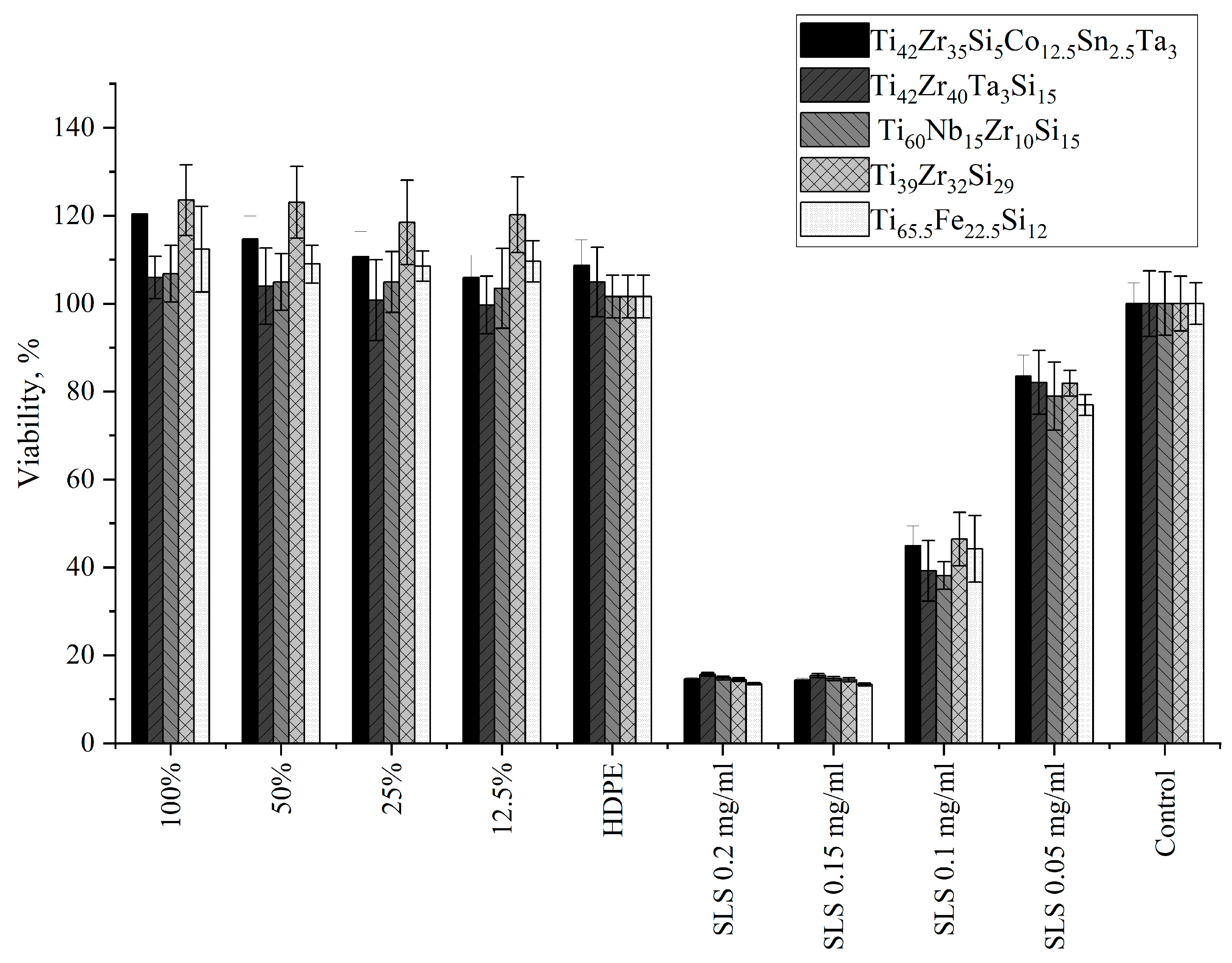 | Ti42Zr35Si5Co12.5Sn2.5Ta3 | 0 | Single intracytoplasmic granules; no cell lysis observed; no inhibition of cell growth | 120.36 | 100.00 | 0.000161 |