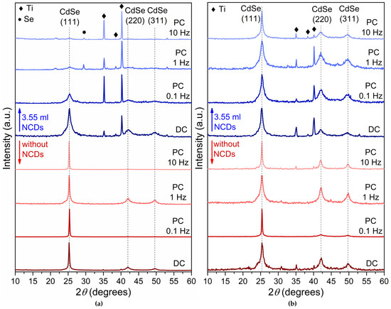 Figure 2 depicts the X-ray diffraction spectra of plain CdSe thin films (in red color) and CdSe thin films produced with the addition of the NCDs solution in the electrolytic bath (in blue color) deposited under −0.6 V/SCE (Figure 2a) and −0.7 V/SCE (Figure 2b) using both DC and PC.