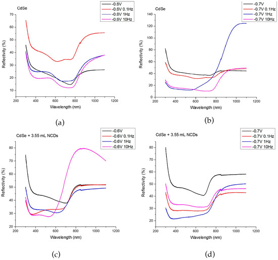 In Figure 5a,b, the reflectivity spectra of plain CdSe thin films are presented for the prepared coatings at –0.6 and –0.7 applied voltages, respectively. A decrease in reflectivity and a simultaneous increase in absorption within the wavelength range of approximately 400 nm to 800 nm is revealed, with energy gaps ranging from 1.58 eV to 1.73 eV. Since these variations do not exceed the measurement uncertainty (±0.05 eV), the differences between the plain CdSe samples under all voltages and pulse frequencies are not considered significant, indicating that the electronic structure of CdSe remains essentially unaffected in the absence of NCDs.