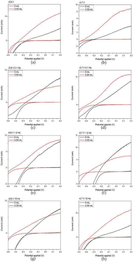 Electrochemical photoelectrochemical (PEC) potential and photoinduced current responses under illumination of 1000 W/m2 for thin films prepared from an acidic aqueous solution by varying the electrodeposition parameters. Black curves correspond to films prepared without NCDs, while red curves correspond to films prepared with the addition of 3.55 mL NCDs to the deposition bath. Graphs (a,c,e,g) show measurements recorded at an applied potential of −0.6 V/SCE with modulation frequencies of 0.1 Hz, 0.1 Hz, 1.0 Hz, and 10 Hz, respectively, whereas graphs (b,d,f,h) show measurements recorded at −0.7 V/SCE with modulation frequencies of 0.1 Hz, 0.1 Hz, 1.0 Hz, and 10 Hz, respectively.