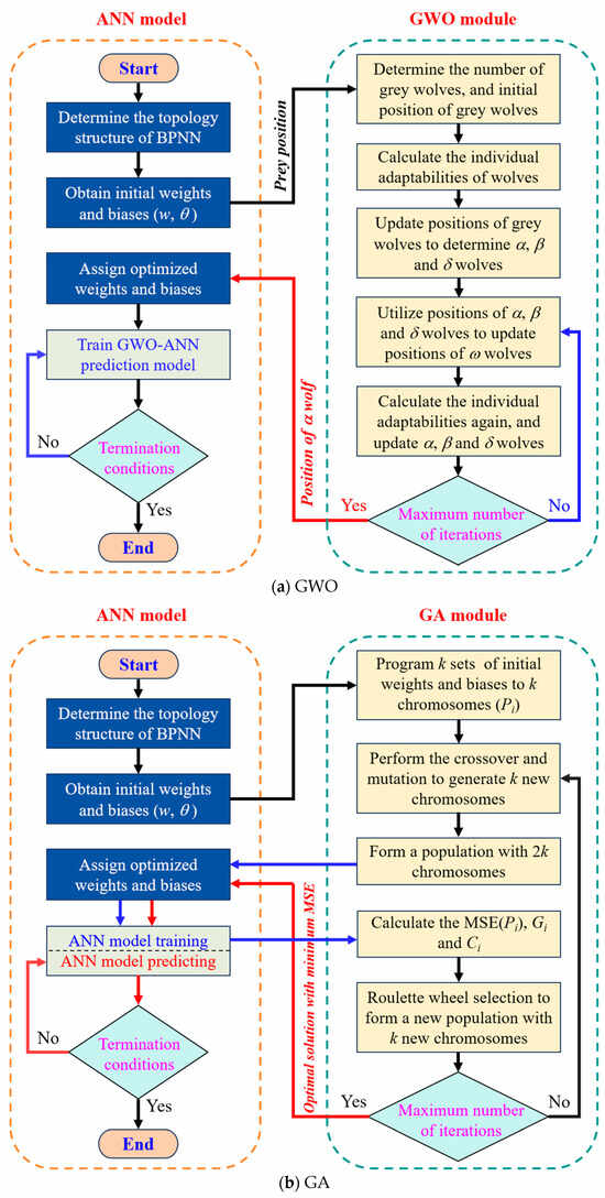 The GWO is a global optimization algorithm that helps avoid the local convergence problem of ANN models. It simulates the leadership hierarchy of grey wolves, where α, β, and δ wolves guide the search, and ω wolves follow. During the iterative hunting process, the wolf with the best fitness becomes the α wolf, representing the current global optimum. Therefore, using GWO to optimize an ANN means updating its weights and biases based on the wolf pack’s search behavior. The overall process is shown in Figure 7a. Firstly, the number of grey wolves (n) is determined, and n sets of initial weights and biases are randomly generated as the position coordinates of n grey wolves. Meanwhile, the initial weights and biases of the ANN model are used as the coordinates of prey. The surrounding algorithm constructed by Mirjalili et al. [38], expressed as Equations (8) and (9), is used to update the coordinates of the grey wolves.
