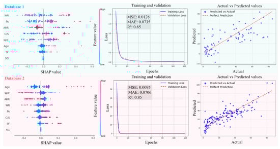 Figure 11, Figure 12, Figure 13 and Figure 14 present the SHAP interpretation plots, training and validation loss curves, and scatter plots of the predicted vs. actual values for the ANN model before and after intelligent algorithm optimization. The loss curves not only reflect the prediction accuracy of the model but also provide an intuitive view of the training process. If the training loss continues to decrease while the gap between validation and training losses widens, this indicates a potential overfitting problem, where the model learns excessively from the training data, thereby impairing its generalization ability on the validation set. Conversely, if both training and validation losses steadily decrease and converge, the risk of overfitting is low, and the model can perform well on both datasets. As shown in Figure 11, Figure 12, Figure 13 and Figure 14, the ANN, GWO-ANN, and PSO-ANN models demonstrate a favorable training status, while the GA-ANN model exhibits noticeable overfitting during training, which is primarily attributed to the inherent complexity of the GA. Due to its strong search capability, the GA tends to over-learn anomalous or non-representative data points in small datasets, such as database 1, mistakenly identifying them as critical patterns. This results in poor performance on the validation set, namely, the gap between validation and training losses widens.