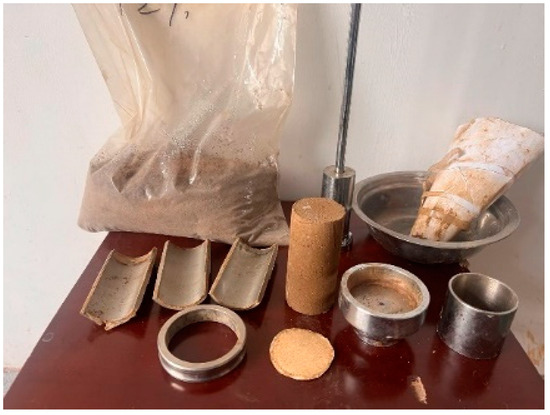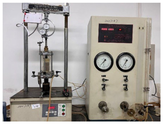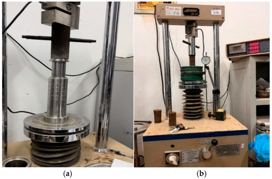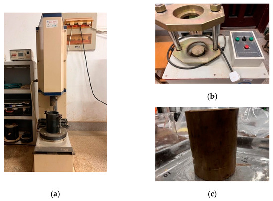 This study used consolidated undrained triaxial tests to analyze the stress–strain curve, failure mode, and shear strength parameters of modified sludge soil. The experiment used a strain gauge triaxial apparatus produced by Nanjing Soil Instrument Factory, as shown in Figure 5. The specimen preparation used the compactor shown in Figure 6, with a diameter of 39.1 mm and a height of 80 mm. The experiment selected 3 and 7 days as the curing age, and all specimens were subjected to saturation treatment. After reaching the curing age, the specimen was wrapped in a thin film and placed in a saturator for saturation using the suction method.