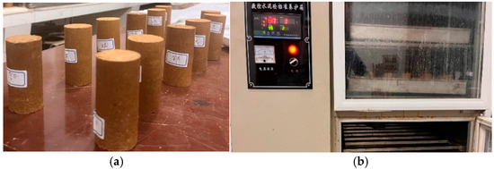 Taking into account both options, the total number of specimens for unconfined compressive strength testing is 70. The sample size is 3.91 cm × 8 cm, and the compaction degree was set to 95%. The material used for the soil sample was calculated based on the compaction degree and maximum dry density. The unconfined compressive strength test was prepared using the compression method, as shown in Figure 2a. The instrument used is a universal press, as shown in Figure 2b. The diameter of the pressure head is slightly larger than the specimen, and the sensor range is 30 kN, used to read longitudinal pressure. The displacement range was 30 mm, and a dial gauge was used for reading. The specimens were cured in a standard curing room, with temperature and humidity set to 20 °C and 90 ± 5% RH, respectively. The appearance of the specimen is shown in Figure 3a, and the curing box is shown in Figure 3b.