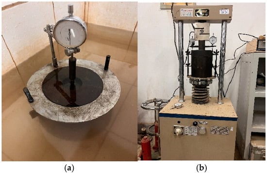 Sample preparation and unconfined compressive strength test: (a) preparation of specimen; (b) unconfined compression strength test.