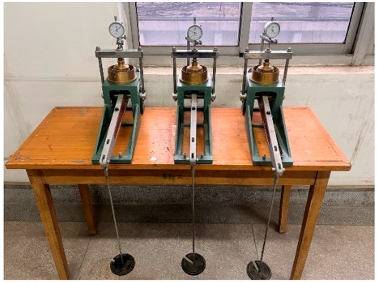 The specimens were prepared by the compression method, and the amount was calculated based on the compaction degree. They were cured in a standard curing environment until the specified age, as shown in Figure 7. Vacuum saturation was performed before the test. After installing the specimen, the consolidation instrument was adjusted to zero under preloading cell pressure, and the inner ring dial gauge was immediately loaded once it was greater than zero. The first level load was 50 kPa, and then the settlement rate and consolidation coefficient were measured according to the specifications. After 24 h of consolidation and stability, 100 kPa, 200 kPa, and 400 kPa loads were applied sequentially. The process is detailed in Figure 8. The number of specimens was 14, with dosages of 4%, 8%, 10%, 12%, and 15%. The compaction degrees for the 10% dosage were 92%, 94%, and 96%, respectively. The curing ages are 3 days and 7 days, respectively. The main consolidation performance indicators include the following: initial porosity (), unit settlement (), compression coefficient within a certain load range (), compression modulus () within a certain load range, volumetric compression modulus (), and compression index ().