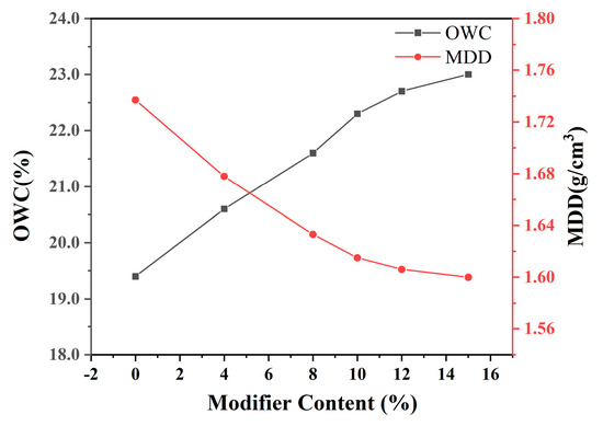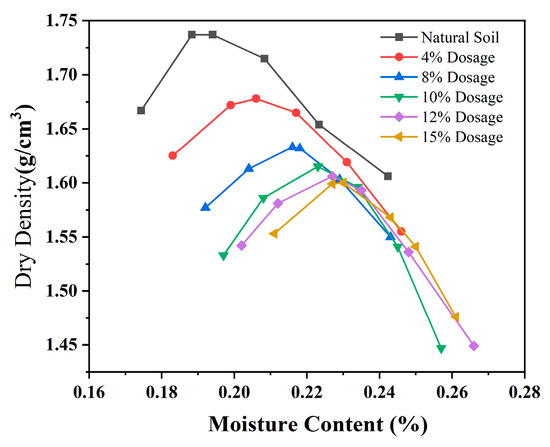 From the compaction curve in Figure 10, it can be seen that the optimal moisture content of modified sludge soil increases with the increase in modifier dosage. Within the range of pure soil to 15% content, the optimal moisture content increases from 19.4% to 23.0%, with the growth rate initially fast and then slow, and the increase slows down after 10% content. This indicates that the modifier causes soil particles to aggregate, increasing the water and work required for compaction, as the modifier reduces the water film on the surface of the clay particles and requires more water lubrication.