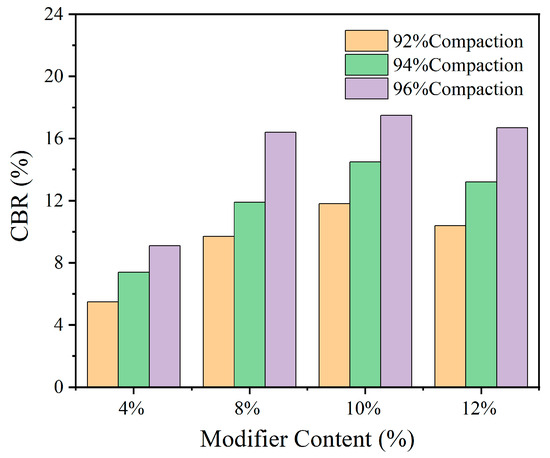 The CBR test data are shown in Table 3, and Figure 13 is used to analyze the variation in CBR with the change in modifier dosage under different compaction degrees. Referring to the results of the unconfined compressive strength test, the initial moisture content is set at 65%. Within 7 days of curing, the strength has basically formed. Therefore, 7 days are selected as the curing age for the CBR test.