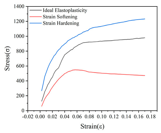 Figure 14 shows three basic types of stress–strain relationships: strain hardening type, ideal elastoplastic type, and strain softening type. These types are closely related to the stress state and internal structure of the specimen, influenced by factors such as the amount of modifier and confining pressure. At the same dosage, as the confining pressure increases, the specimen tends towards the strain hardening type; under the same confining pressure, as the dosage increases, the specimen tends towards the strain softening type.