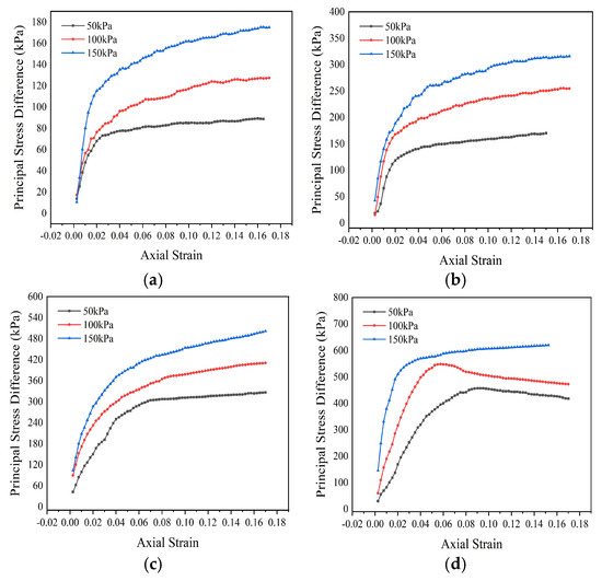 Stress–strain relationship of specimens under different confining pressures: (a) 50 kPa; (b) 100 kPa; (c) 150 kPa.