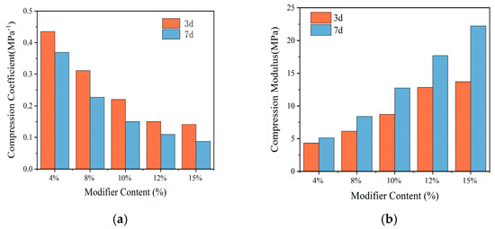 Modifier dosage vs. compressive properties: (a) the influence on compression coefficient; (b) the influence on compression modulus.