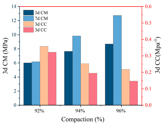 Figure 18 shows that the compression coefficient of modified sludge soil decreases with increasing compaction degree. The addition of modifiers quickly enhances the strength and initial compressive resistance of modified sludge soil. But as the curing age increases, the hydration reaction slows down, and the compression deformation of low-pressure solid specimens is large, while the compression performance of high-pressure solid specimens is improved more significantly due to a denser skeleton.