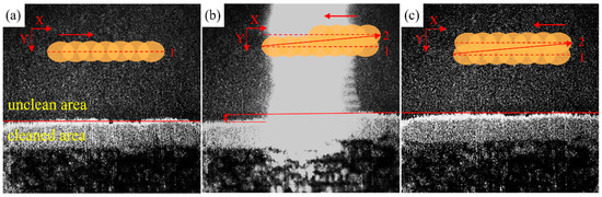 The process of laser cleaning: (a) laser spot completes scanning path 1; (b) laser spot is moving; (c) laser spot completes scanning path 2. The dashed lines indicate the laser scanning paths, and the arrows indicate the scanning directions.