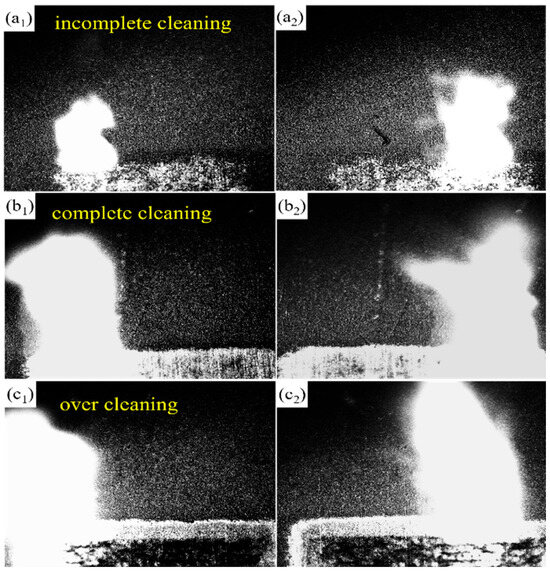 Laser cleaning dynamic behavior: (a1,a2) 1.27 J/cm2; (b1,b2) 3.82 J/cm2; (c1,c2) 6.37 J/cm2.