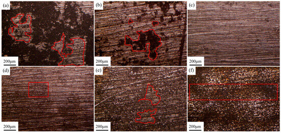 where Pv is the average laser power, f is the pulse frequency, and d is the diameter of the focused spot. The pulse frequency used in this experiment is 10 kHz and the diameter of the focused spot is 1 mm. Figure 5 shows the surface morphology of the sample after laser cleaning at different laser fluences. As shown in Figure 5a, there is a large amount of graphite residue on the surface of the sample with a laser fluence of 1.27 J/cm2. The majority of the sample surface is still obscured by the black graphite lubrication coating, with only certain areas (indicated by the circled regions in the figure) revealing the magnesium alloy morphology. As the laser fluence escalates from 2.55 to 5.09 J/cm2, the cleaning efficacy of the coating markedly improves. As shown in Figure 5b–d, the residual amount of graphite was reduced from the local blocky residue in Figure 5b to no obvious residue observable by the naked eye in Figure 5c and Figure 6d, and the magnesium alloy substrate was exposed on the surface of the samples after cleaning. However, partial melting traces are observed in some scratch areas in Figure 5d. Figure 5e,f depict the cleaning outcomes at laser fluences of 6.37 J/cm2 and 7.64 J/cm2, respectively. At these higher fluences levels, while the graphite is entirely eliminated, excessive laser energy adversely impacts the substrate. In Figure 5e, melt marks are evident across much of the sample surface, with localized areas exhibiting a yellowish burn. Meanwhile, in Figure 5f, the entire matrix is covered by melt marks, accompanied by regular parallel stripe-like laser overlap marks This phenomenon indicates that the surplus laser energy has caused synchronous surface treatment on the exposed magnesium alloy substrate surface after removing the graphite coating within the laser range.