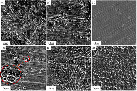 Figure 11 shows the microstructure of the magnesium alloy surface after cleaning with different pulse frequencies observed under a scanning electron microscope. The information shown in Figure 11 is the same as that in Figure 10. As the pulse frequency increases, the cleaning efficacy of the membrane coating gradually decreases.