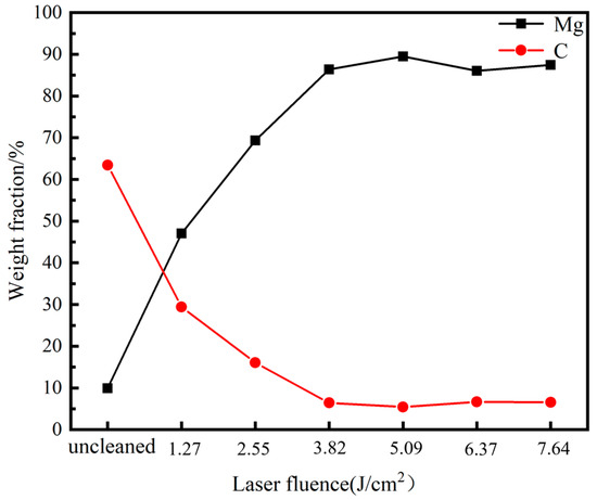 Figure 7 shows the EDS scanning results of the cleaned sample surface at different average powers. The surface of the uncleaned sample is composed of C (~63.43 wt%)—the main component of the graphite coating, O (~25.42 wt%) and Mg (~9.0 wt%), Zn, Si, and other elements. This study defines clearance rate as the percentage of the difference in surface graphite content before and after cleaning to the initial surface graphite content. As the average power increases from 1.27 to 1.27 J/cm2, the C content decreases, while the Mg content gradually increases. Within the range of 1.27~3.82 J/cm2, the C content exhibits a significant downward trend, decreasing from 63.43% before cleaning to 6.42%, the clearance rate reaches 89.88% at 3.82 J/cm2. These data indicate that increasing laser fluence within this range significantly improves the cleaning efficacy of the lubrication coating. The curve tends to stabilize within the range of 3.82 to 7.64 J/cm2, and the clearance rate remains at around 90%. The cleaning efficacy is optimal at the laser fluence of 5.09 J/cm2, achieving a clearance rate of 91.46%, slightly higher than 89.88% at 3.82 J/cm2.