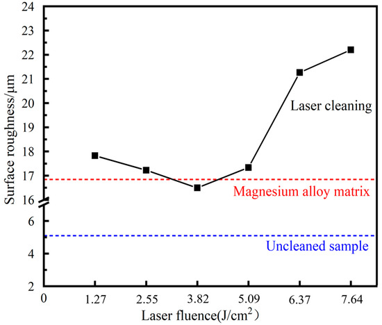 Laser action can alter the microstructure of the substrate surface, which can impact the properties of the magnesium alloy substrate. Figure 8 displays the three-dimensional microstructure of the sample surface after cleaning with various laser fluences. Figure 9 illustrates the impact of laser fluence on the surface roughness of the cleaned sample. Surface roughness refers to the unevenness of a machined surface with relatively small intervals and tiny peaks and valleys. In this paper, the description of the surface roughness value refers to the arithmetic mean deviation Ra of the contour, and its measurement principle is the arithmetic mean of the absolute value of the contour deviation distance within the sampling length. As the laser fluence increases from 1.27 to 3.82 J/cm2, the surface roughness of the sample decreases. However, as the laser fluence further increases from 3.82 to 7.64 J/cm2, the surface roughness of the sample increases. The surface roughness of the 3.82 J/cm2 cleaned sample is almost the same as that of the original magnesium alloy substrate surface, indicating that the cleaning efficacy is optimal at 3.82 J/cm2. The graphite has been completely removed without causing any damage to the substrate. The surface roughness of the original substrate and the cleaned sample is significantly higher than that of the uncleaned sample. This phenomenon is due to a large number of scratches on the substrate caused by artificial sandpaper polishing, and the sprayed graphite particles adhere to the surface of the substrate to fill in the uneven scratches, making the surface flat. When the laser fluence is low, the laser cleaning efficacy is poor, and the remaining large graphite on the sample’s surface increases the wave peak, resulting in higher surface roughness. As the laser fluence increases, the amount of residual graphite on the sample surface gradually decreases, leading to a reduction in roughness value. When the laser energy is too high, the excess energy is absorbed by the substrate, causing surface melting. Moreover, the higher the laser fluence, the more severe the melting becomes. Due to the short duration of pulsed laser action, the molten metal cools down before it can flow rapidly, leading to increased laser fluence and higher roughness.