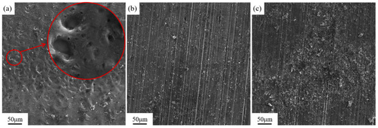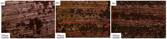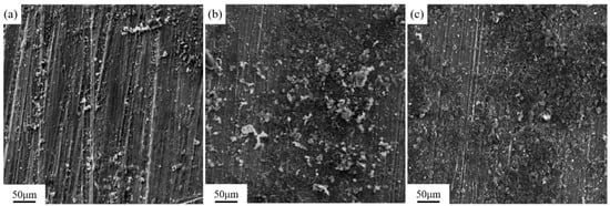 Figure 10 shows the surface morphology of the samples after laser cleaning at different pulse frequencies. Three pulse frequencies of 10 kHz, 20 kHz, and 30 kHz were selected for laser cleaning experiments. In Figure 10a, it can be observed that after cleaning at 10 kHz, most of the bright magnesium alloy matrix is exposed on the surface of the sample, indicating a more effective cleaning outcome. In Figure 10b, after cleaning at 20 kHz, there is a significant increase in residual graphite, and the cleaned area shows no apparent metallic luster. As shown in Figure 10c, after cleaning at 30 kHz, the surface displays distinct rows of laser spot motion traces. The residual strip of graphite at the overlap of the two rows has not been removed, and the residual graphite coating in the area where the center energy of the laser spot moves higher is thicker than at 20 kHz.