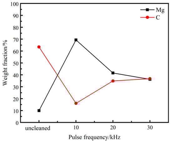 Figure 12 shows the EDS scanning results of the cleaned sample surface at various pulse frequencies. As the pulse frequency increases from 10 to 30 kHz, the C content increases, while the Mg content decreases gradually. Under the pulse frequency of 10 kHz, the C content on the surface of the sample is 16.05%, and the clearance rate is 74.70%, which is 32.63% higher than that at 30 kHz. According to Figure 12, reducing the pulse frequency can significantly enhance the cleaning efficacy of the lubrication coating.