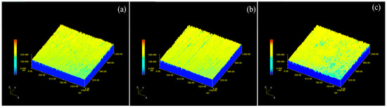 3D Micromorphology of sample surface after cleaning with different pulse frequencies: (a) 10 kHz; (b) 20 kHz; (c) 30 kHz.