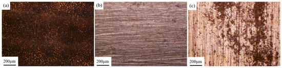 Macromorphology of sample surface after laser cleaning at different scanning speeds: (a) 1000 mm/s; (b) 3000 mm/s; (c) 5000 mm/s.